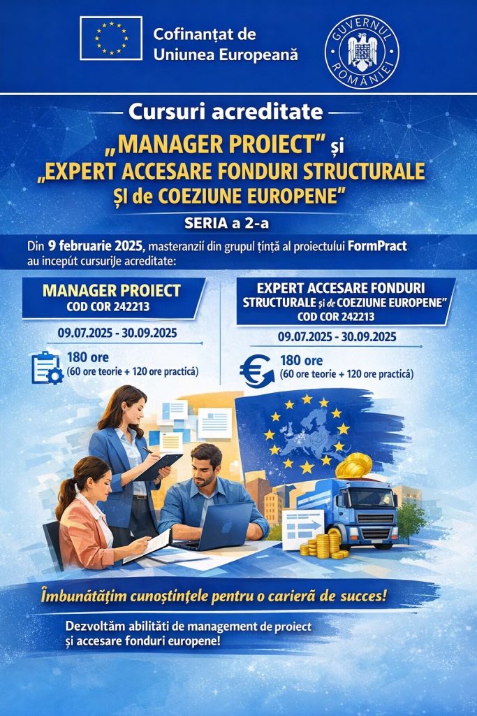 - ,,MANAGER PROIECT” (studii superioare), COD COR 242213, tipul programului Specializare, cu un număr de 180 ore (din care 60 ore pregătire teoretică şi 120 ore pregătire practică), în perioada 09.07.2025- 30.09.2025